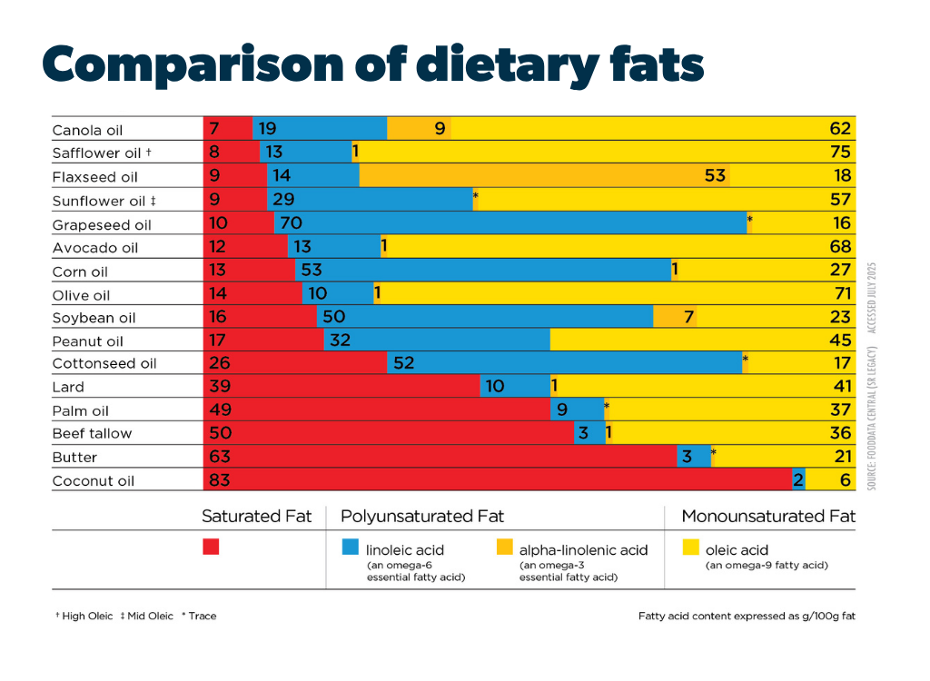 All fats are composed of smaller units called fatty acids, and each type of fat is made up of a unique combination of them. The combination or ‘profile’ of different fats can impact health in different ways.
