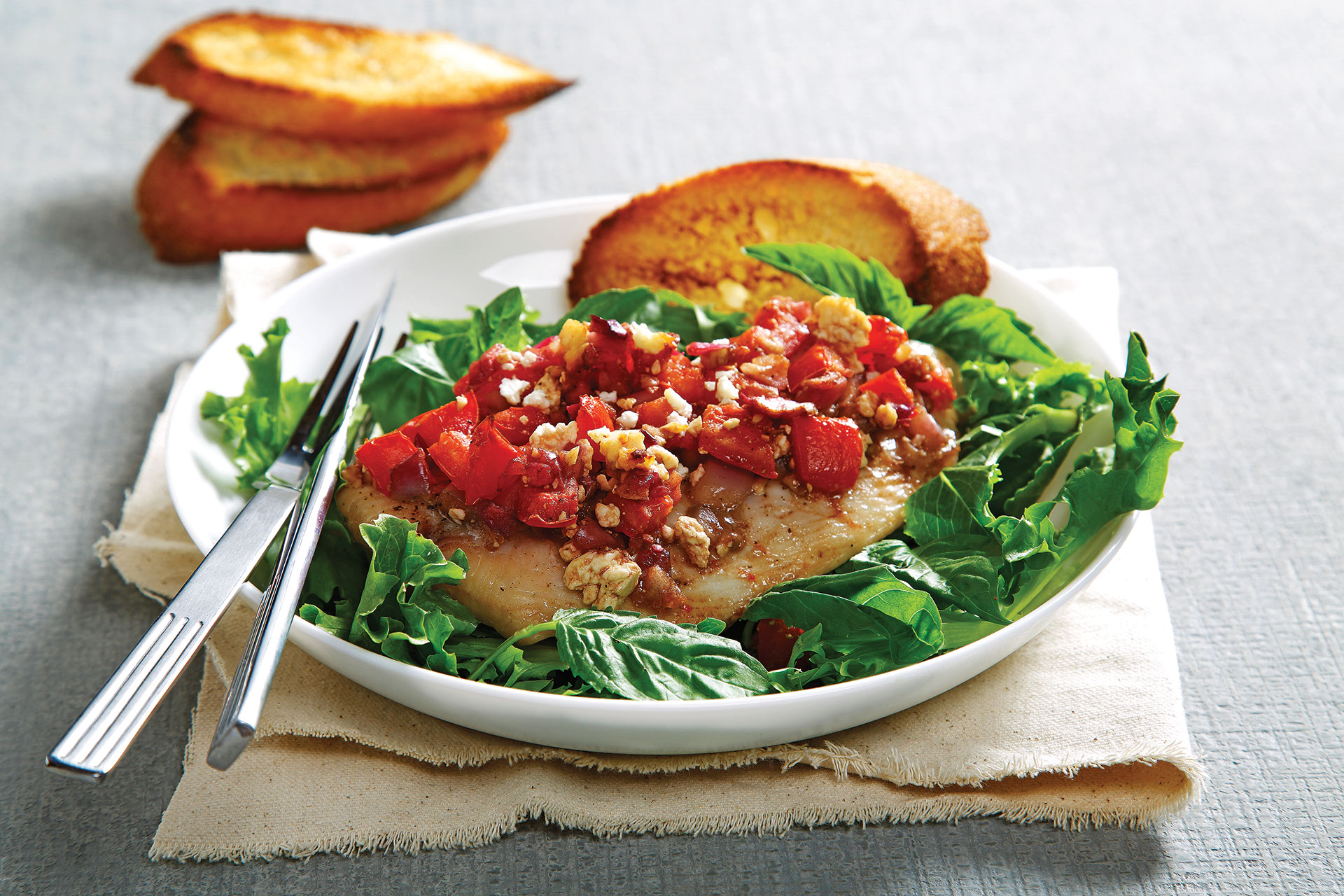 All the flavours of bruschetta you know and love paired with flaky and delicious white fish. For a complete meal, serve on a bed of your favourite greens with a side of crusty bread. Recipe courtesy of howtoeat.ca.