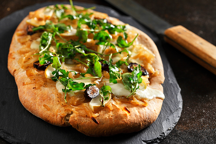 Impress your friends by making your own delectable flatbread topped with caramelized onions, figs, pears, leafy arugula and bocconcini cheese. Slice into appetizer sized pieces for your next ladies night!