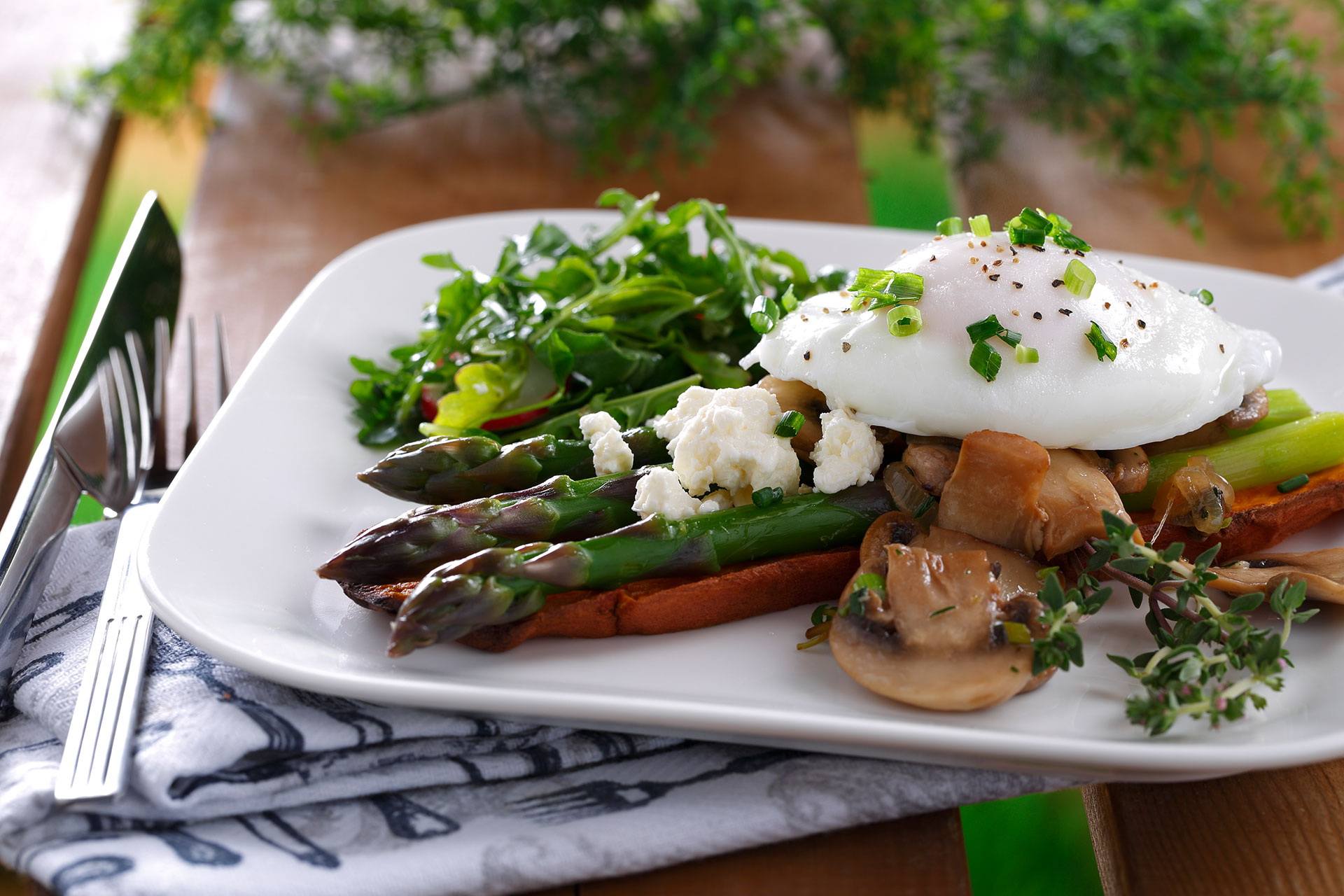 Poached Eggs with Asparagus & Mushrooms on Sweet Potato Toast